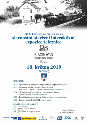 V sobotu 18.5.2019 proběhne v Borovanech slavnostní otevření interaktivní expozice železnice. V 16.25 bude z Budějovic vypravený speciální vlak do Borovan s doprovodným programem. Dále se můžete těšit na slavnostní průvod k borovanskému klášteru, kde si můžete expozici prohlédnout. Od 19.00 hodin zahraje ve Stodole v zahradě kapela Element. Zároveň se můžete přijít podívat do našeho obchůdku v Podzámčí, který pro vás v tento den otevřeme od 16.00 - 20.00 hod.